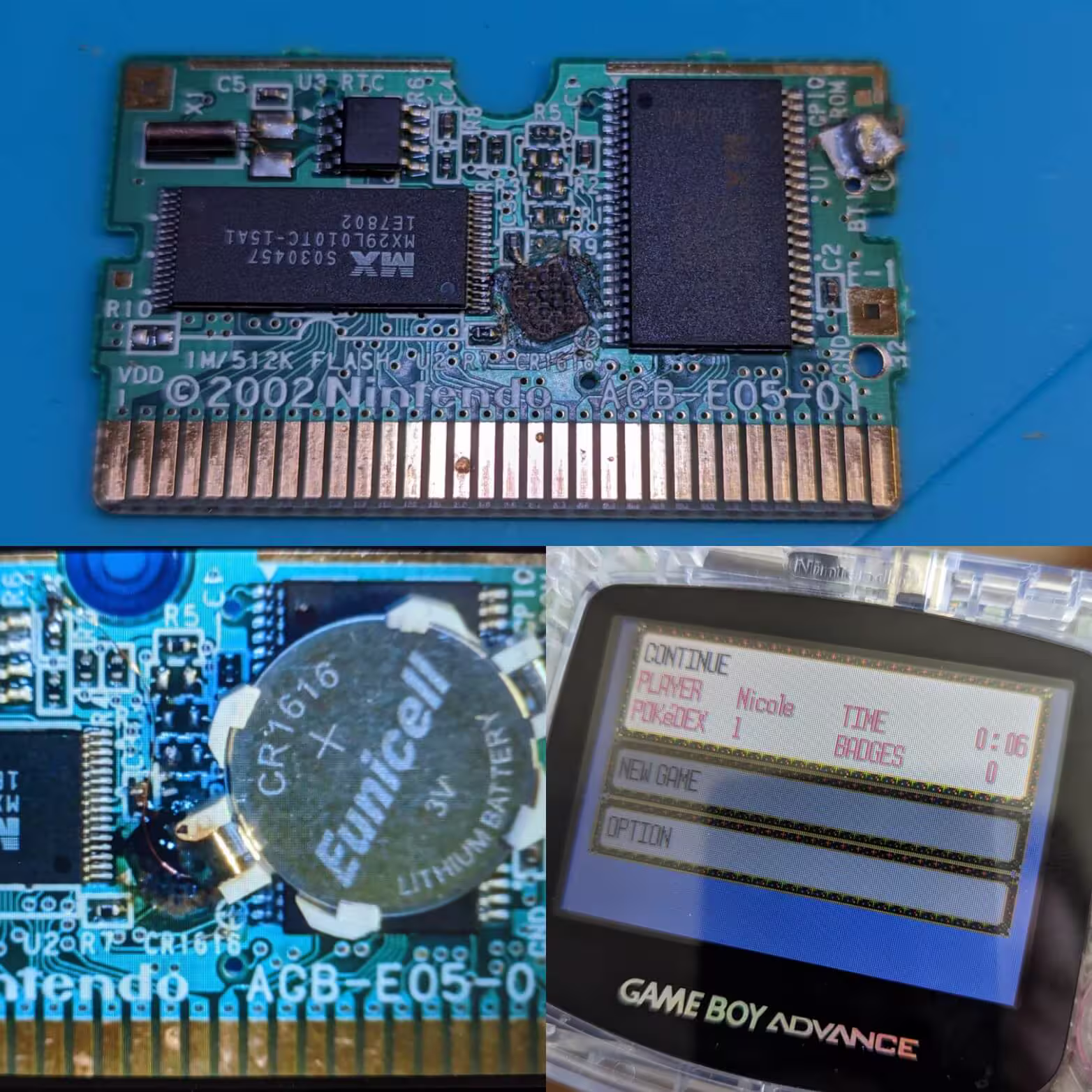 This Game Boy Advance game, although worked, requires a battery for the real time clock aspects of the game (i.e. timed events). The problem was that there was a repair attempt that had taken off the entire pad for the battery, and in fact had go through the pad, through the silk screen and had gone all the way into the fibre glass insulation layer (you might be able to see in the photo the woven pattern).