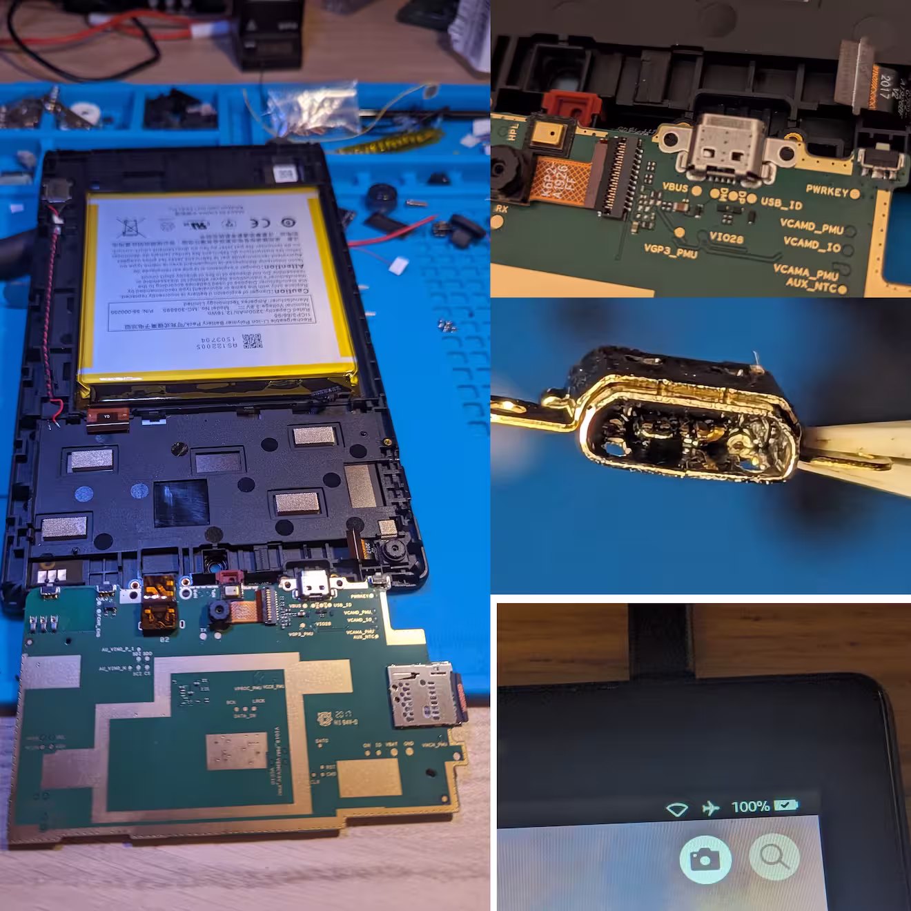I'd not fixed a Kindle before, but my guess was the USB port was probably at fault. Inspecting it under the microscope (and looking at the mouth of the port) I could see it was definitely the problem. It's understandable that a young child isn't always going to connect the USB cable cleanly and the port had eventually given up the ghost.